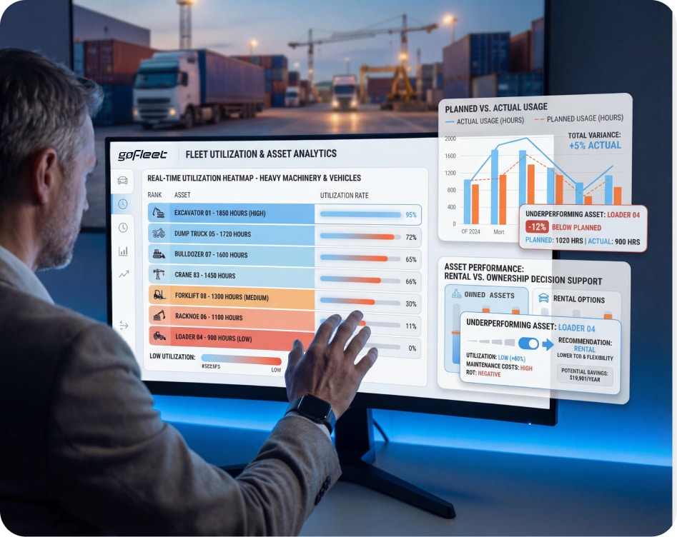 Site-level and fleet-level utilization rates. Compare planned vs. actual usage. Identify underperforming assets. Export data for rental vs. own decisions.