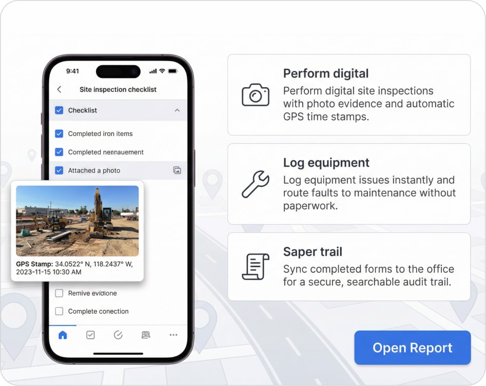 Site inspections, equipment issue logs, and field forms captured digitally. Eliminate paper. Create a record trail from the field to the office.