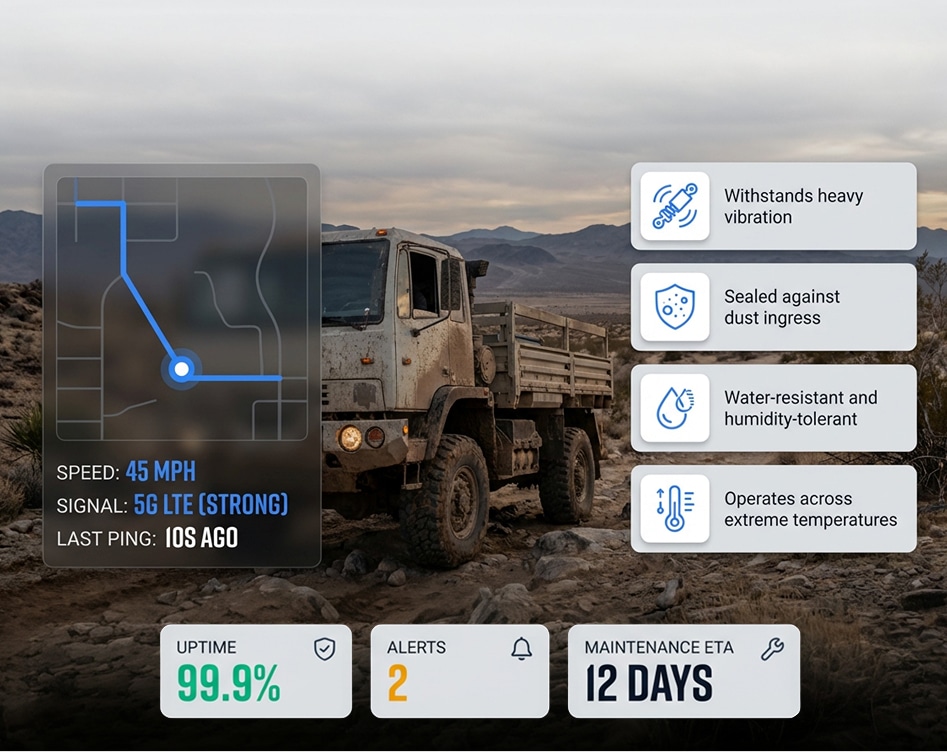 Trackers are rated for vibration, dust, moisture, and temperature extremes. Off-road environments are the design specification — not an afterthought.