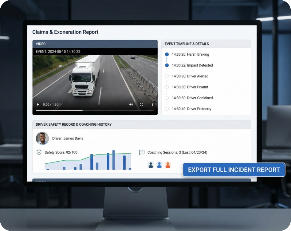 Many insurers offer premium reductions for fleets with active video telematics and documented coaching programs. The system also provides organized exoneration evidence for claims disputes.