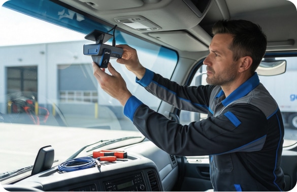 We deploy commercial-grade AI dash cameras with road-facing, cabin-facing, and optional auxiliary views. Hardware is pre-configured and professionally installed.